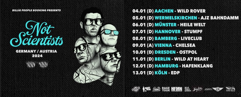Wir machen gerade Winterpause, aber im kommenden Jahr geht’s gleich wieder los. Schon am 4. Januar stehen wir wieder auf der Bühne, und zwar als Support für die französische Kultgruppe Not Scientists, die bei ihrer Tour durch Deutschland und Österreich auch in Aix-La-Chapelle vorbeischauen. Rock on!
