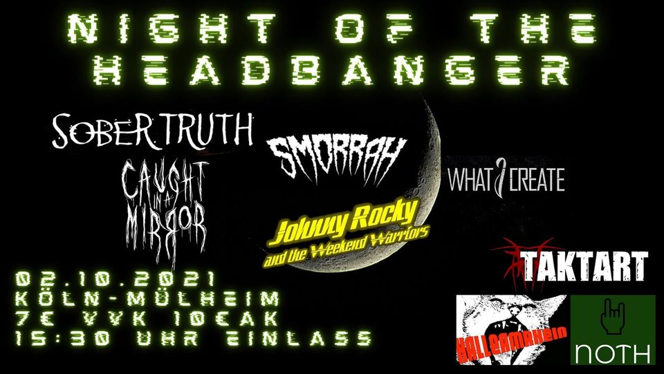 wir dürfen euch heute den ersten Auftritt des Jahres 2020 verkünden: Am 21.03. spielen Johnny Rocky and the Weekend Warriors bei der legendären „Night of the Headbanger“ im schönen Köln. Mit uns rocken Sober Truth, SMORRAH und Caught in a Mirror die Halle am Rhein. Also kommt schön und bangt eure Köpfe!